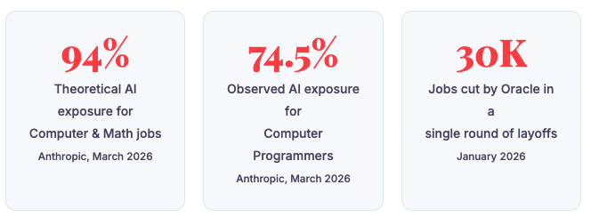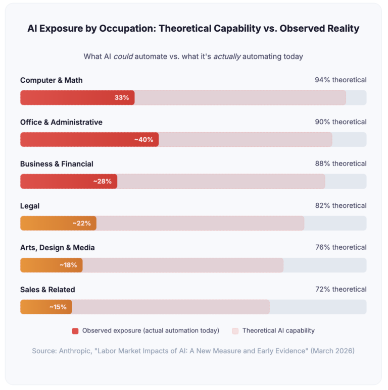 In their Labor Market Impacts of AI report (March 2026), Anthropic introduced a new metric called “observed exposure” — measuring not what AI could theoretically automate, but what it’s actually automating right now in real workplaces. The results are staggering.