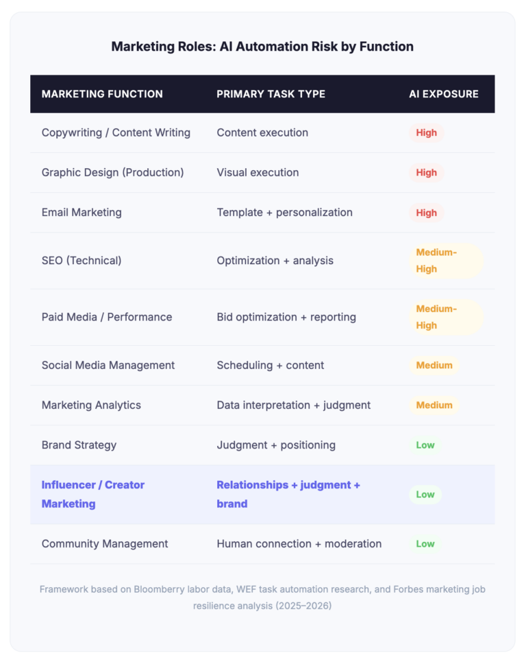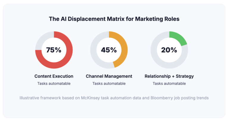 The pattern is clear. The more a marketing role depends on producing outputs — words, images, data summaries, optimized bids — the more exposed it is. The more it depends on human judgment, relationships, and taste — the more protected it is.