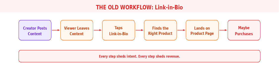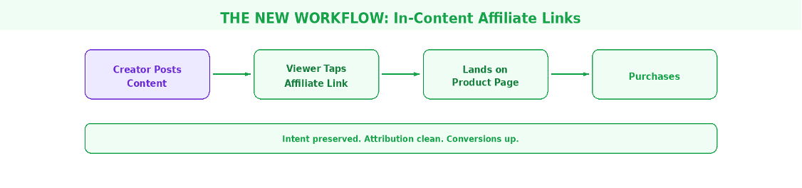 Previously, both types of traffic got funneled through the same link-in-bio. A viewer who was motivated by a specific Reel still had to leave the content, navigate to the profile, tap the link, find the right product in a menu, and then complete the purchase. All of that friction was diluting bottom-of-funnel intent. In-content affiliate links give that high-intent traffic a direct path. The link-in-bio loses its monopoly on the most valuable click in the creator ecosystem.